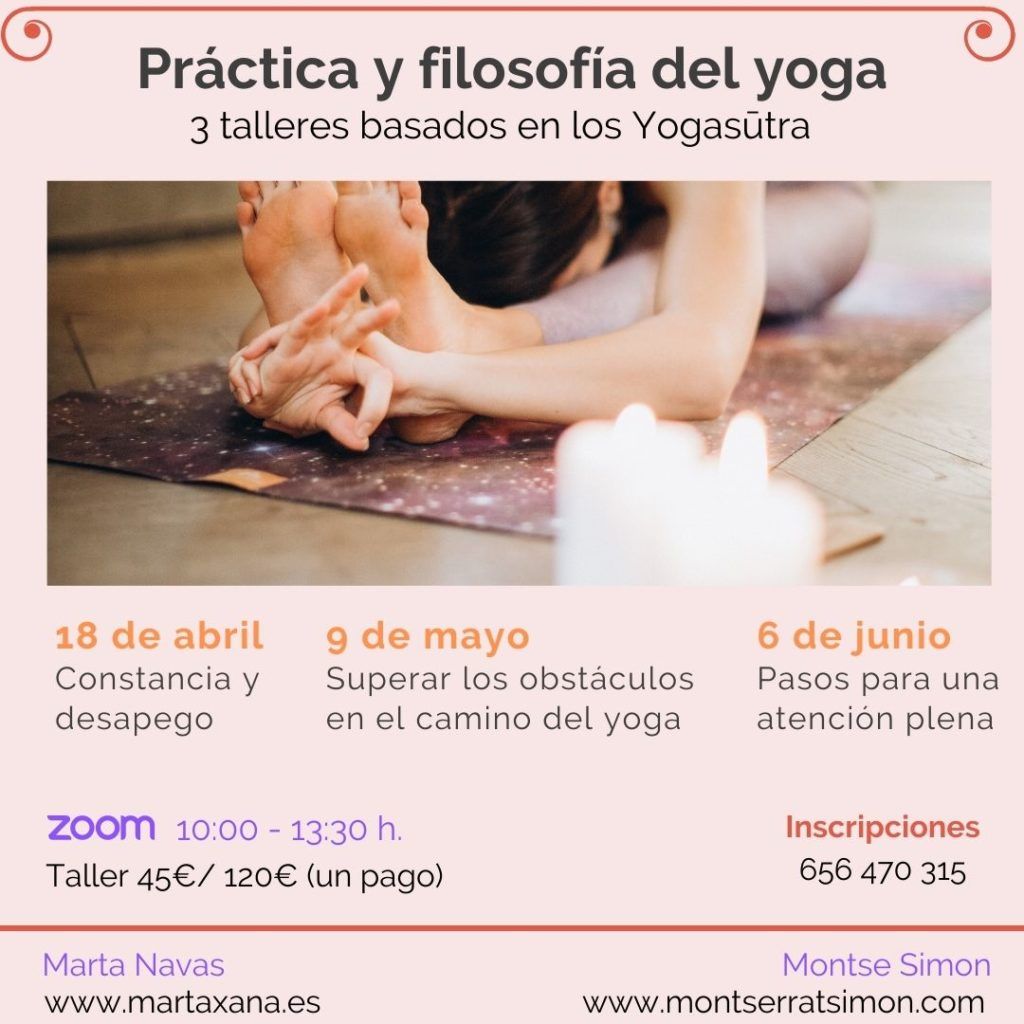 Ciclo de tres talleres onlines de Yoga y filosofía, basado en los Yogasutra de Patañjali y acercando algunas propuestas de este texto de la antigüedad a nuestra vida actual. Para apuntarte llama o escribe un wsp al teléfono que aparece en el cartel.